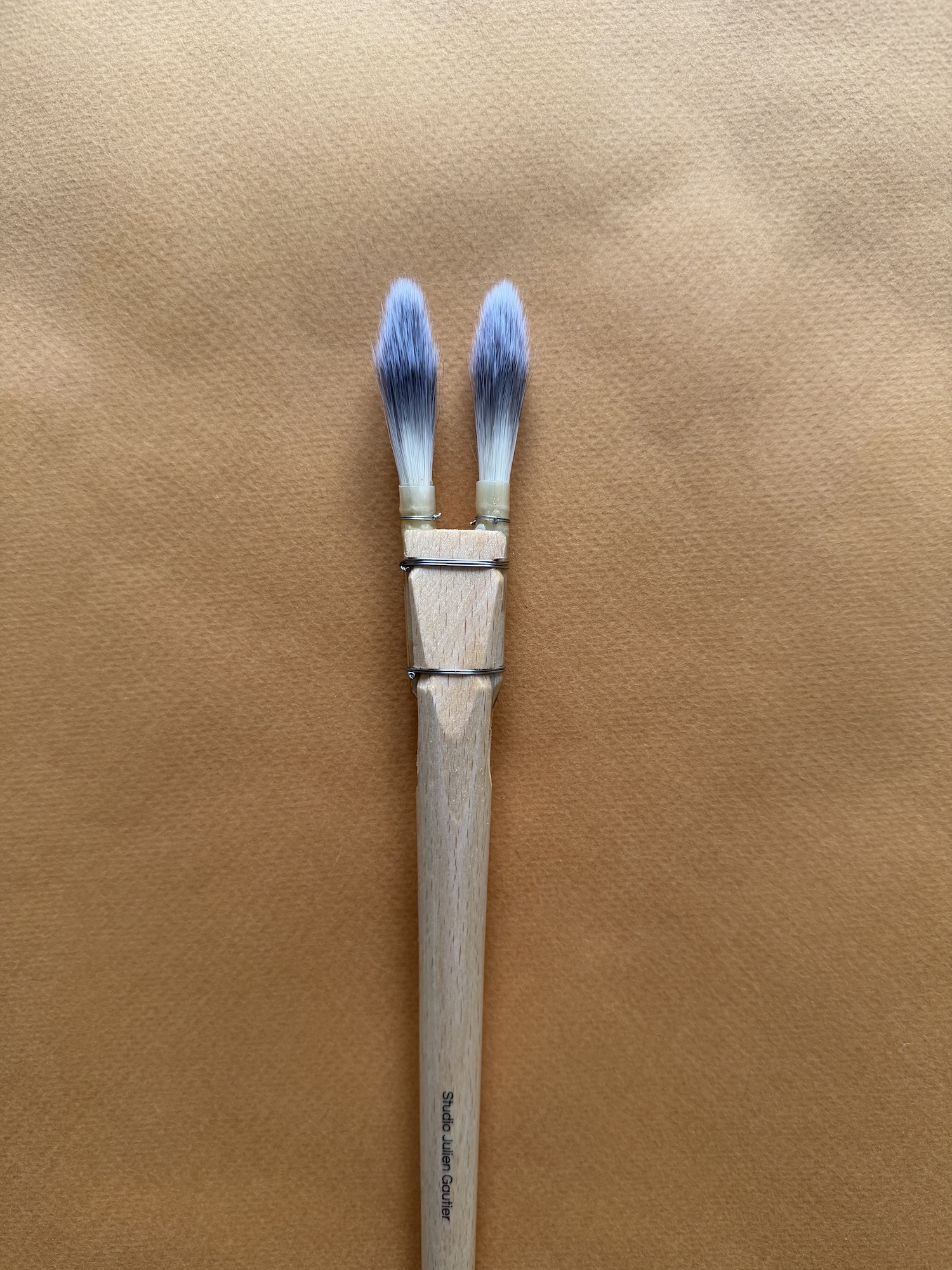 Bout du pinceau très pointu quand les fibres sont mouillées ou chargées avec un glacis coloré. Précision des deux pointes.