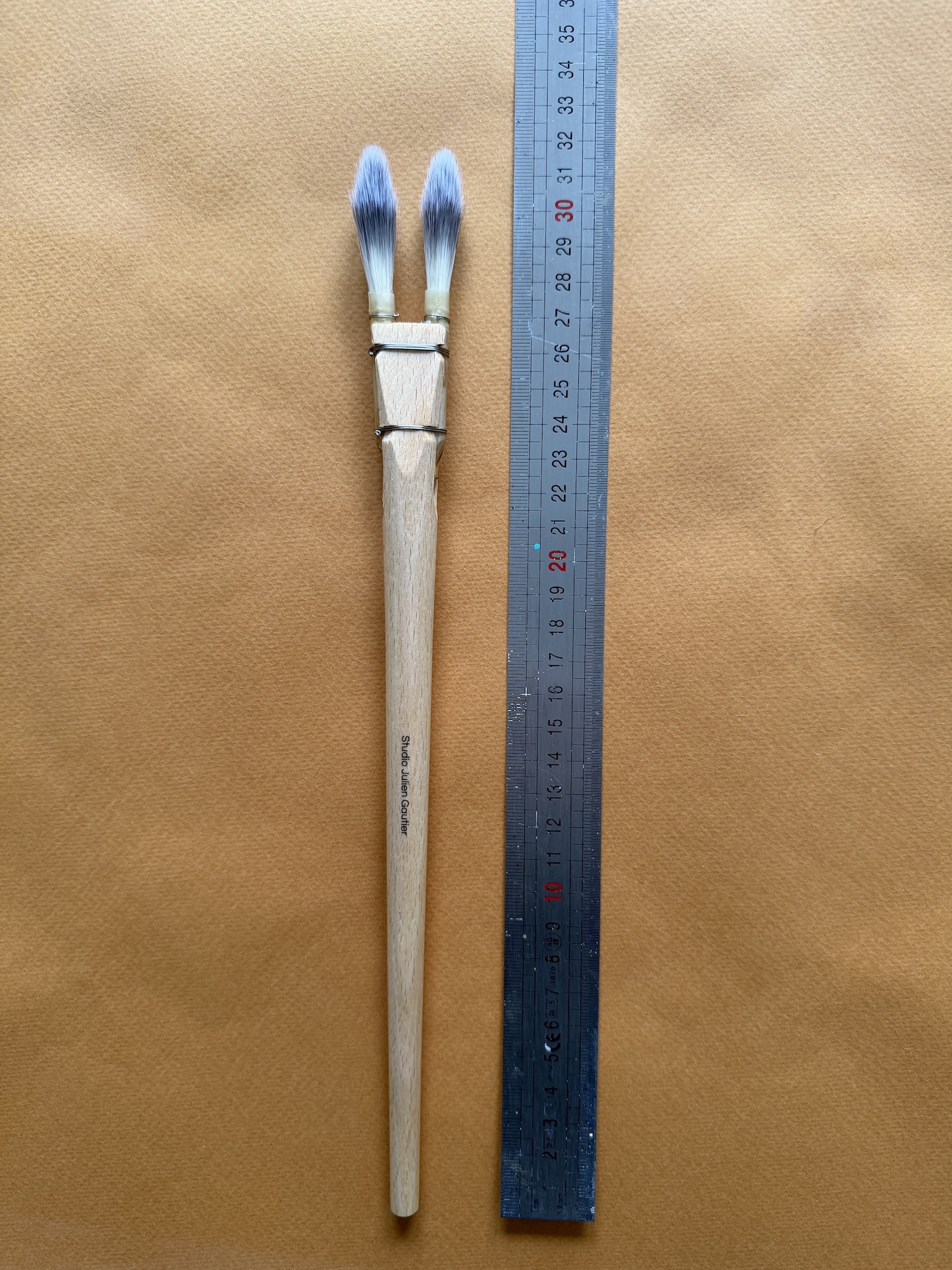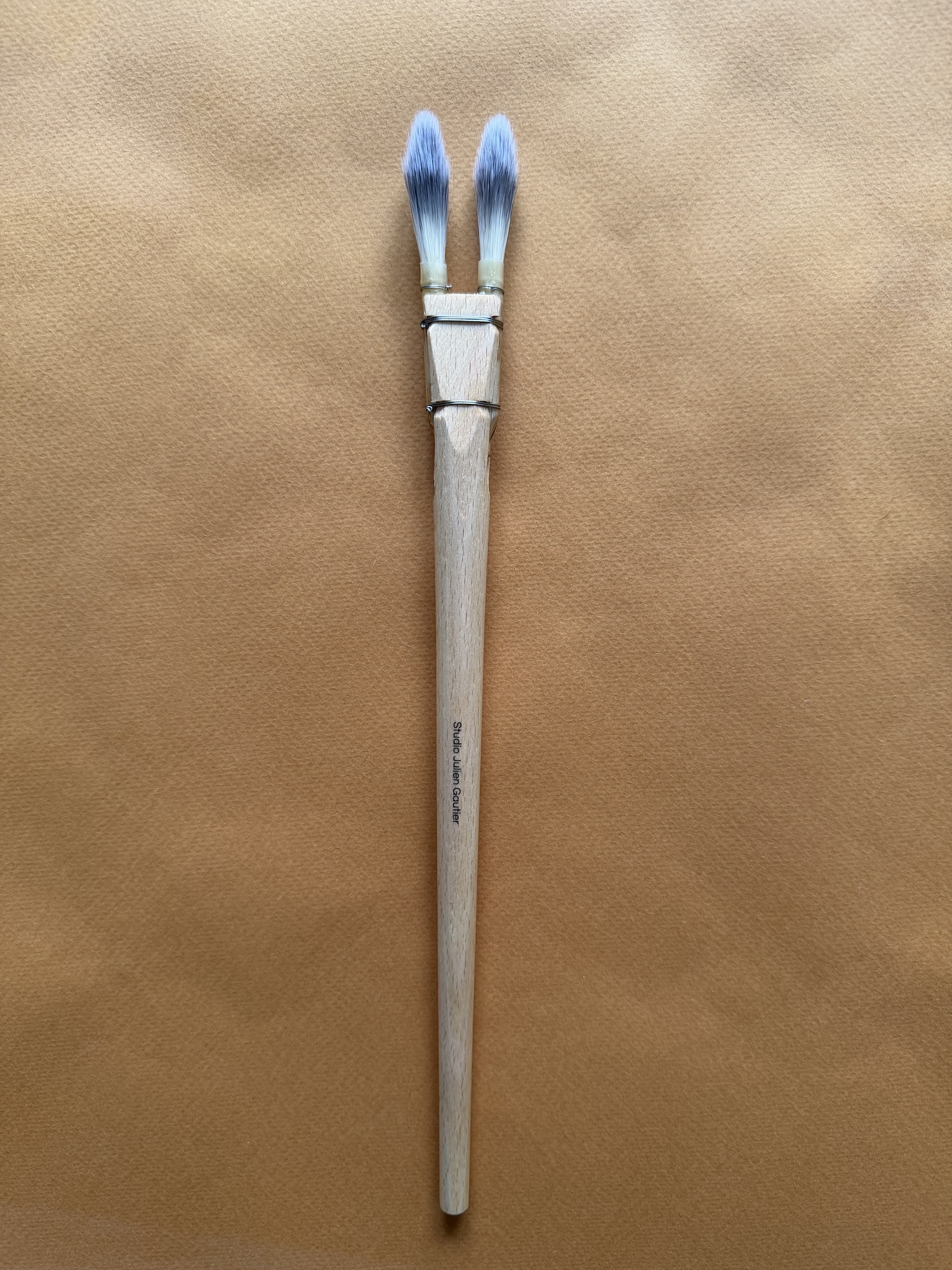 Pinceau deux mèches fibres synthétiques, manche vernis.